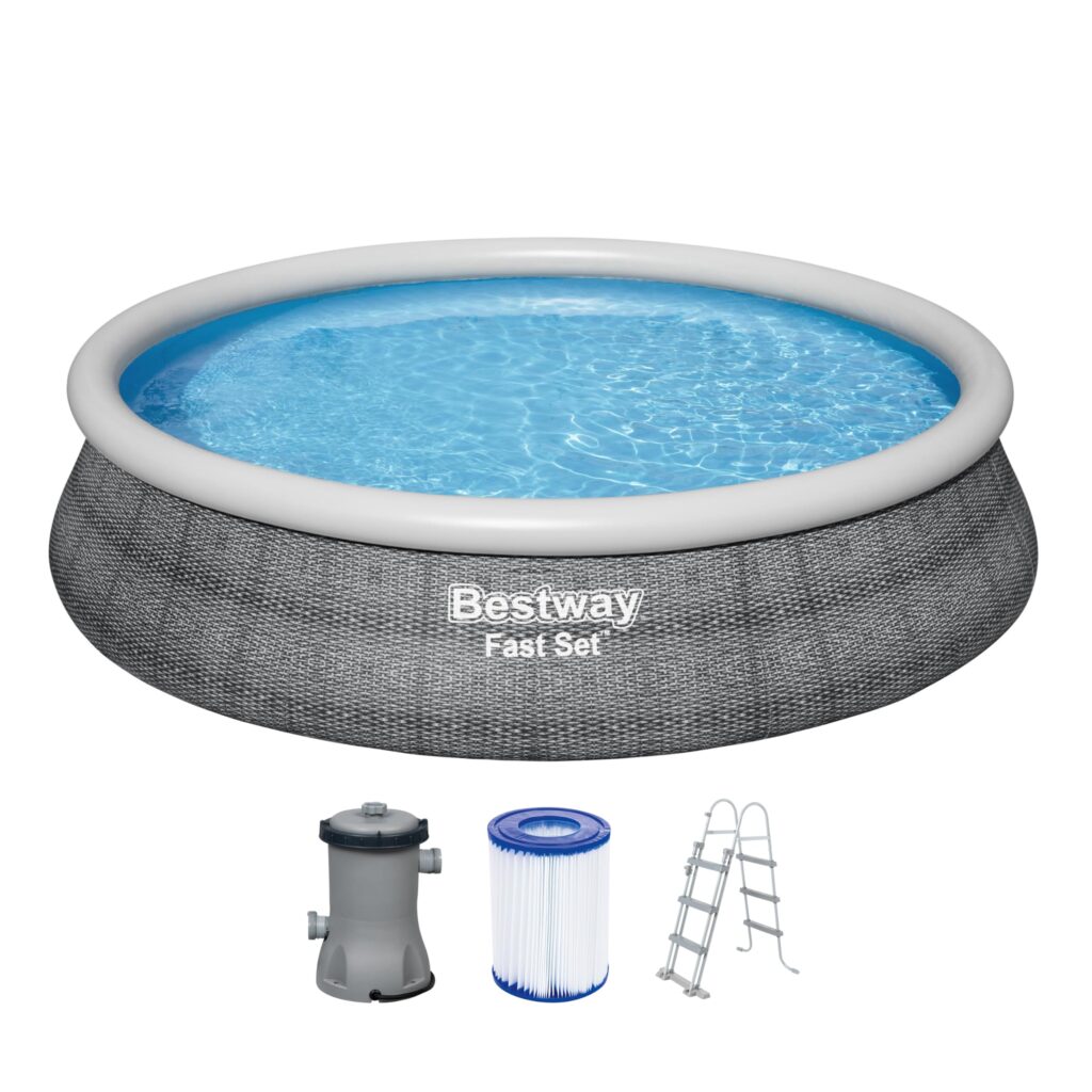 Dieses Set enthält außerdem eine Filterpumpe (Pumpenleistung: 3.028 l/h, Durchflussrate: 2.028 l/h), sowie Sicherheitsleiter, Abdeckplane und einem ChemConnect™ Chemikaliendosierer. Letzterer sorgt für sauberes, gesundes Poolwasser, indem er genau die richtige Menge Chlor gleichmäßig im gesamten Pool verteilt.